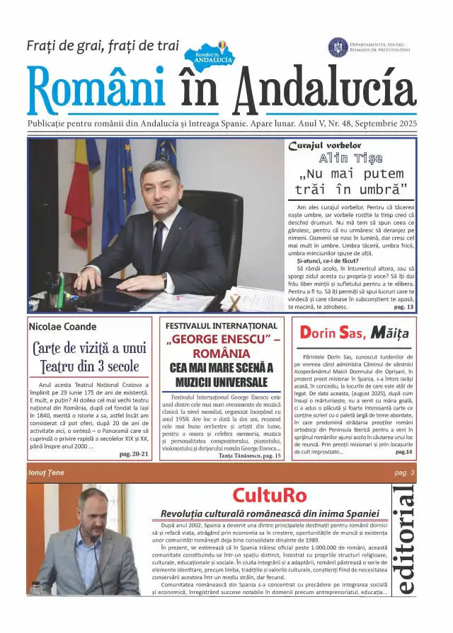 A apărut numărul 48 al Publicației ”Români in Andalucía – Frați de grai, frați de trai”, Septembrie, 2025 Publicația ”Români in Andalucía – Frați de grai, frați de trai”, Nr. 48, Anul V, Septembrie, 2025 „ROMÂNI IN ANDALUCÍA” – Păstrători ai culturii românești dincolo de granițele țării. Mulțumirile noastre tuturor celor care au făcut posibilă realizarea acestui număr! Din cuprins: – Editorial: Ionuț Țene –  CultuRo – Revoluția culturală românească din inima Spaniei – Teodora Olteanu – Cultura limbii române: […]