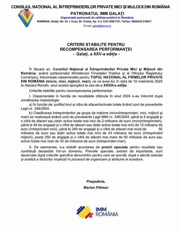 Scris de: Colegiul Director al Patronatului Întreprinderilor Mici și Mijlocii Galați Data : 25 - sept. - 2025 Adauga Comentarii 565 Vizite Citeste
