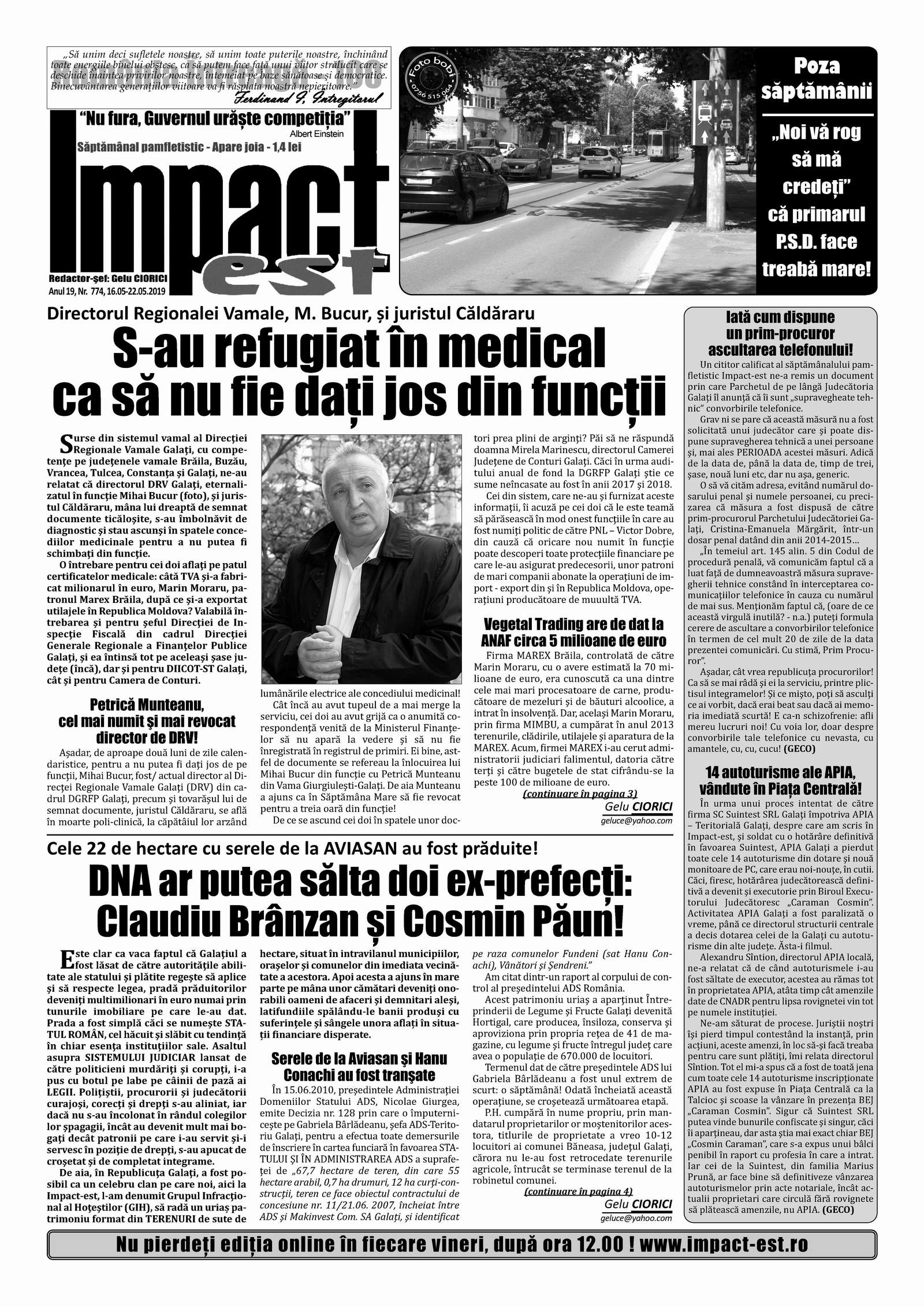 Surse din sistemul vamal al Direcţiei Regionale Vamale Galaţi, cu competenţe pe judeţenele vamale Brăila, Buzău, Vrancea, Tulcea, Constanţa şi Galaţi, ne-au relatat că directorul DRV Galaţi, eternalizatul în funcţie Mihai Bucur (foto), şi juristul Căldăraru, mâna lui dreaptă de semnat documente ticăloşite, s-au îmbolnăvit de diagnostic şi stau ascunşi în spatele concediilor medicinale pentru a nu putea fi schimbaţi din funcţie. O întrebare pentru cei doi aflaţi pe patul certificatelor medicale: câtă TVA şi-a fabricat milionarul în euro, Marin […]