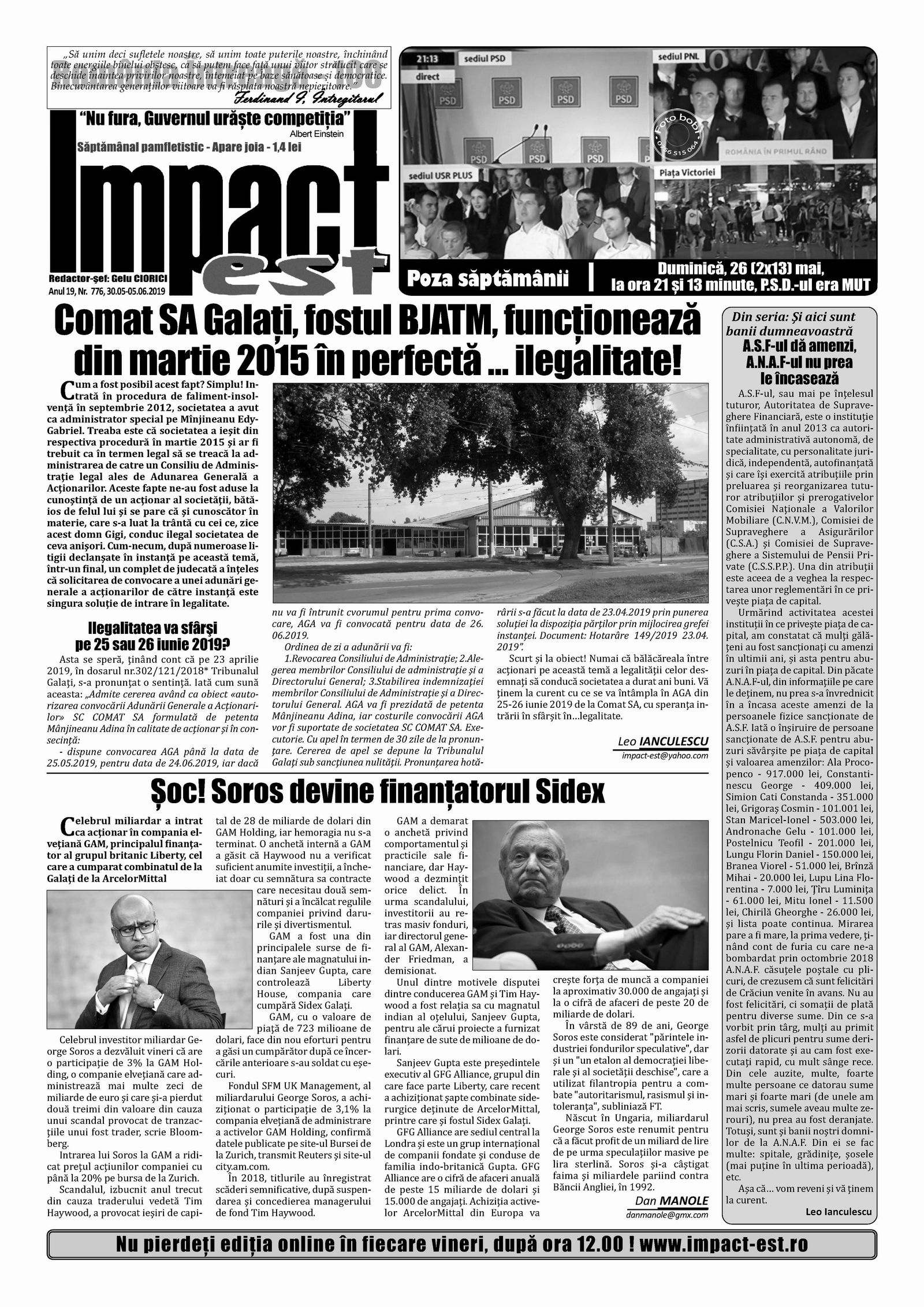 Marţi, 28 mai 2019, au avut loc ultimele sedinţe A.GA. ordinare de la societăţile grupării Chelu, respectiv Vulturul Comarnic SA şi Fricom SA Galaţi. Reporterul nostru de serviciu ne comunică de la „faţa“ locului cele constatate. Ruinele de la Vulturul Comarnic SA La Vulturul Comarnic e de jale: s-a tras cortina Prin birourile de sute de metri prin care lucrau sute de salariaţi t.e.s.a., cu ani în urmă, acum este linişte mormântală. Toate birourile au lacăte la uşi. Societatea nu […]