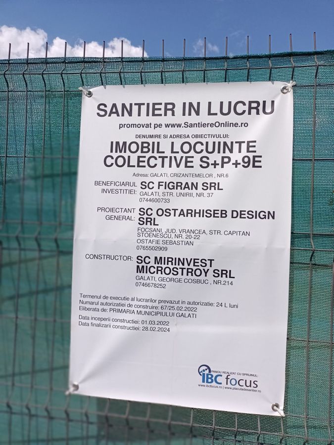 Suprafaţa de 4.505 metri pătraţi (aici este inclus şi terenul de sub sediul Calorgal, moştenitoarea APATERM), situată pe stra Crizantemelor nr. 6, vizavi de ultimele blocuri din Ţiglina 2, valoarează cel puţin 1,35 milioane de euro, dacă preţul ar fi unul corect, adică de măcar 300 de euro metrul pătrat. Cumpărătorul este firma FIGRAN SRL Galaţi, cu sediul în strada Unirii nr. 37. Se pare că astă societate este un dezvoltator imobiliar, întrucât îşi declară puncte de lucru în satul Costi, în comuna Independenţa, pe strada Movilei (e un ansamblu de blocuri aproape de bulevardul George Coşbuc) şi, desigur, pe Crizantemelor nr. 6 ! Un alt punct de lucru este pe Coşbuc nr. 276, unde se află un magazin cu materiale de construcţii. Tot din datele ANAF mai rezultă că firma în cauză, care este beneficiarul viitoarelor blocuri de locuinţe, a avut în 2020 o cifră de afaceri de aproape 30 de milioane de lei şi un profit net de circa 1,4 milioane de lei, cifre realizate cu un număr de 49 de salariaţi. Conform panoului de identificare a ansamblului de locuinţe (vezi foto), rezultă că firma FIGRAN şi-a angajat drept constructor pe MIRINVEST MICROSTORY, care are sediul tot în bulevardul Coşbuc, nr. 2014. Firma constructoare angajată de beneficiar a fost înfiinţată în anul 2019 şi mai are declarată încă o adresă în bulevardul George Coşbuc, la numărul 251 A şi B, Tot conform ANAF, în anul fiscal 2021 a avut o cifră de afaceri de aproape 1,6 milioane de lei şi un profit net sub 320.000 de lei, numărul de salariaţi fiind de 24.