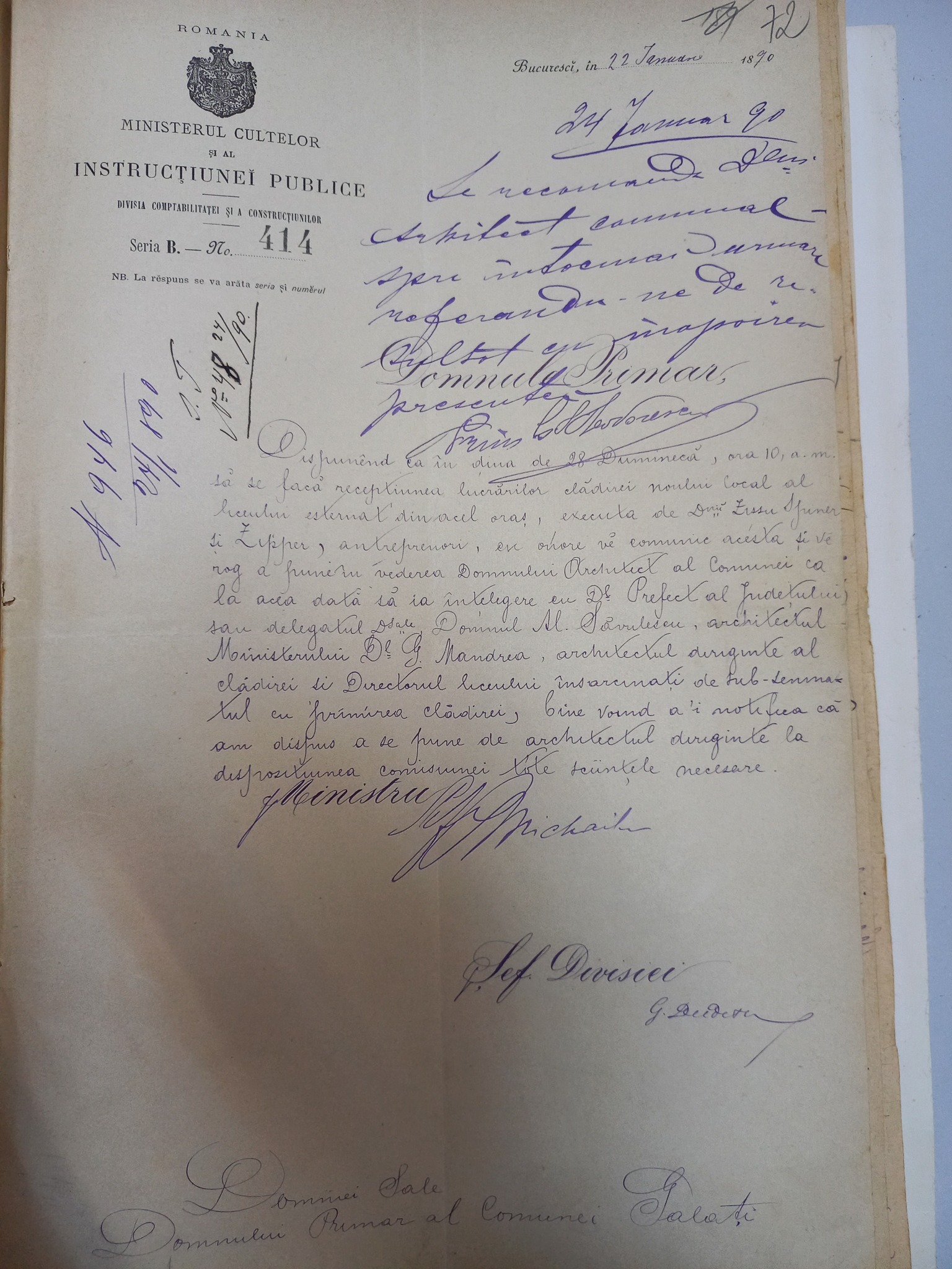 Ministerul Cultelor si al Instructiunii Publice, ,,DIVIZIA SCOALELORU,”anunta Primaria Orasului Galati; ,,Corpurile Legiuitoare, dupa cererea guvernului, au acordatu un creditu de 300 000 lei, pentru cladirea si instalarea unui localu de liceu in Galati. Ministerul este decisu a pune in studiu cat mai curandu facerea planeloru si devizeloru necesare. Pentru aceasta insa este nevoie sa cunoasca terenul pe care este sa se faca cladirea.”