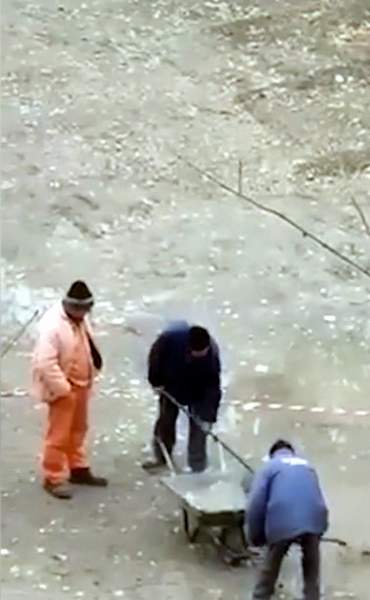4. Câteva zile mai târziu, alţi patru muncitori devin vedete pe reţelele de socializare. Organizaţi pe echipe, doi se prefac că muncesc iar ceilalţi doi îşi privesc tovarăşii, cu interes. Activii au o ocupaţie halucinantă: încarcă apa dintr-o groapă, cu lopeţile, într-o roabă; apoi o răstoarnă câţiva metri mai încolo, într-o zonă unde sunt parcate mai multe maşini.