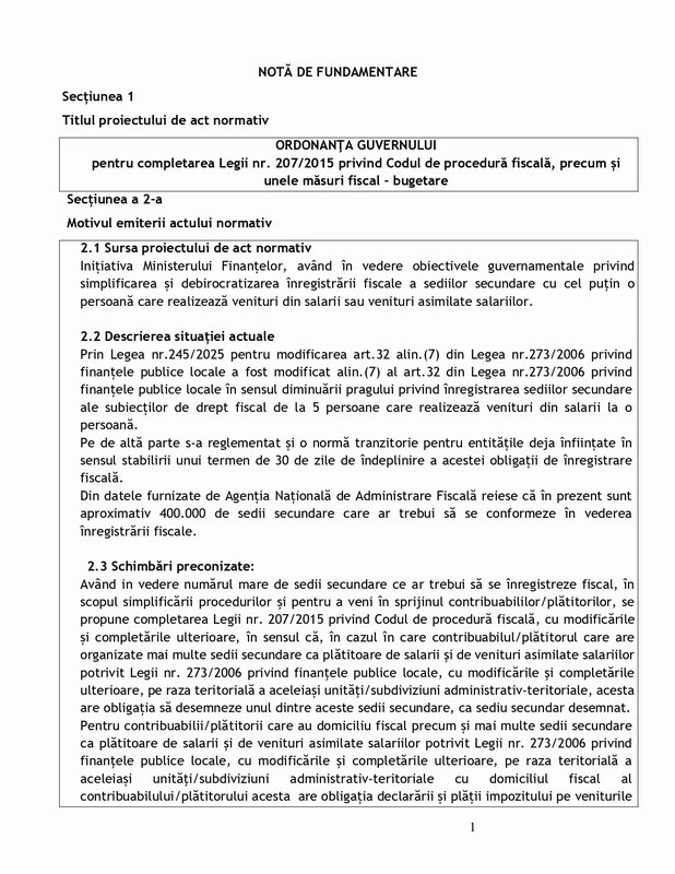 Ministerul Finanțelor a pus în dezbatere publică proiectul de OUG pentru completarea Legii nr. 207/2015 privind Codul de procedură fiscală, precum și unele măsuri fiscal – bugetare  prin care sunt corectate dispozițiile Legii nr. 245/2025 care obligă  întreprinderile care au un sediu secundar cu cel puțin un salariat, să solicite înregistrarea fiscală a entității respective, ca plătitoare de salarii.