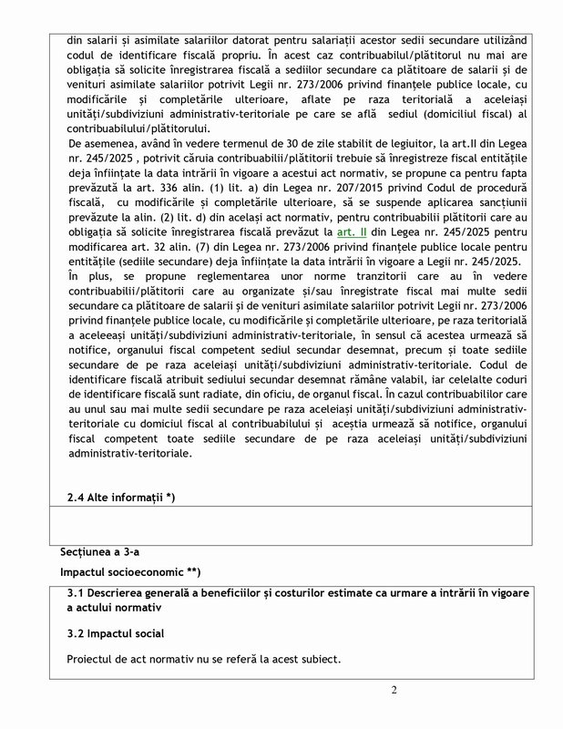 Prin Legea nr. 245 /2025, pentru modificarea Legii finanțelor publice locale, publicată în Monitorul Oficial nr. 1204 din 29 decembrie 2025, a fost introdusă obligația pentru întreprinderile care au un sediu secundar cu cel puțin o persoană care realizează venituri din salarii, să solicite înregistrarea fiscală a entității respective, ca plătitoare de salarii și de venituri asimilate salariilor.